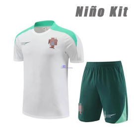 Camiseta de Entrenamiento Portugal Blanco/Verde 2024 Niño Kit> Corte clásico.> El conjunto incluye camiseta y pantalón corto.> Pantalón corto con cintura elástica.> Tejido ligero, tacto sedoso, con efecto secado rápido y ligeramente elástico.> No se preocupe por la claridad de los logotipos de los clubs, marcas, nombres de los patroc..