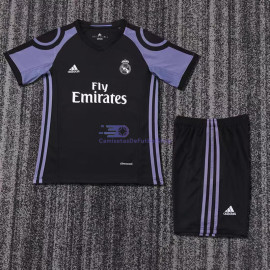 Camiseta Real Madrid 16/17 Tercera Equipación Retro Niño Kit> Corte clásico.> El conjunto incluye camiseta y pantalón corto.> Pantalón corto con cintura elástica.> Tejido ligero, tacto sedoso, con efecto secado rápido y ligeramente elástico.> No se preocupe por la claridad de los logotipos de los clubs, marcas, nombres de los patroci..