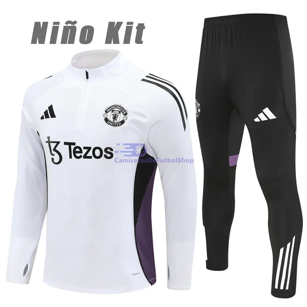 Sudadera De Entrenamiento Manchester United 2025/2026 Niño Kit Blanco/Morado> Corte clásico.> Incluye sudadera y pantalón largo.> Pantalón largo con cintura elástica.> Tejido ligero, tacto sedoso, con efecto secado rápido y ligeramente elástico.> No se preocupe por la claridad de los logotipos de los clubs, marcas, nombres de los pat..