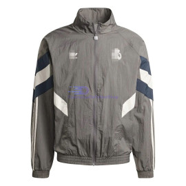 Cortavientos Real Madrid Gris 2024/2025> Corte clásico.> Tejido ligero, tacto sedoso, con efecto secado rápido y ligeramente elástico.> El ajuste estándar sigue su cuerpo con espacio adicional para la movilidad.> No se preocupe por la claridad de los logotipos de los clubs, marcas, nombres de los patrocinadores en las fotos de cami..