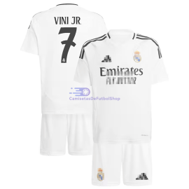 Camiseta Vini Jr. 7 Real Madrid 2024/2025 Primera Equipación Niño Kit> Corte clásico.> El conjunto incluye camiseta y pantalón corto.> Pantalón corto con cintura elástica.> Tejido ligero, tacto sedoso, con efecto secado rápido y ligeramente elástico.> No se preocupe por la claridad de los logotipos de los clubs, marcas, nombres de lo..