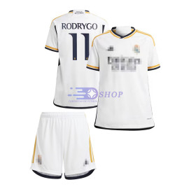 Camiseta Rodrygo 11 Real Madrid 2023/2024 1ª Equipación Niño Kit> Corte clásico.> El conjunto incluye camiseta y pantalón corto.> Pantalón corto con cintura elástica.> Tejido ligero, tacto sedoso, con efecto secado rápido y ligeramente elástico.> No se preocupe por la claridad de los logotipos de los clubs, marcas, nombres de los pat..